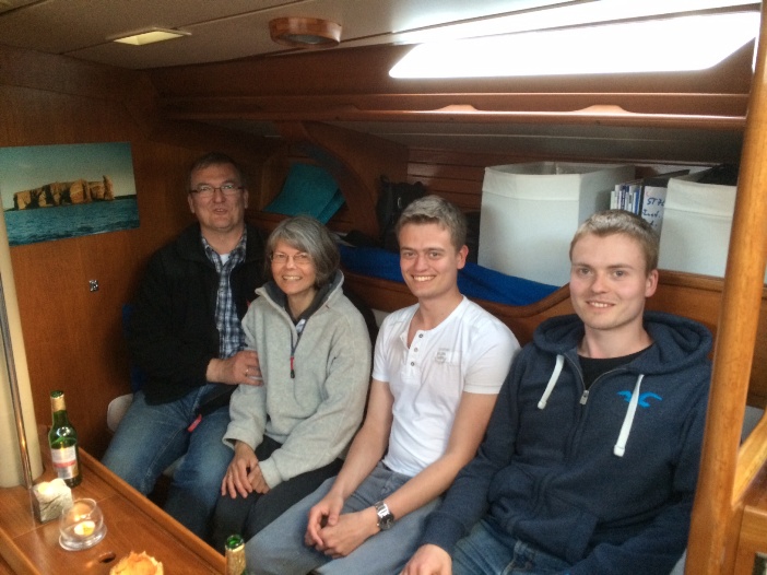 Das lange Himmelfahrts-Wochenende haben wir für einen Probeschlag nach Helgoland genutzt. Auch die Jungs waren dabei, ein vorerst letztes Familienwochenende. Die Stimmung war prima und die neuen Ausrüstungsteile konnten erprobt und für sehr gut befunden werden. Das neue Großsegel von CO-Segel steht ausgzeichnet, und die Windfahnensteueranlage von Windpilot funktioniert auch einwandfrei. Bei einem geselligen Abend bei Freunden an Bord ist das obige Foto entstanden. Henning und Malte sind wieder in Bremen, und wir erledigen weitere Restarbeiten an der "Amazone".