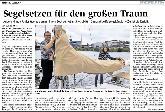 Montag waren ein Journalist und ein Fotograf der Nordsee-Zeitung bei uns an Bord. Den Reporter habe ich ziemlich zugetextet. Mal sehen, was davon zu lesen sein wird.