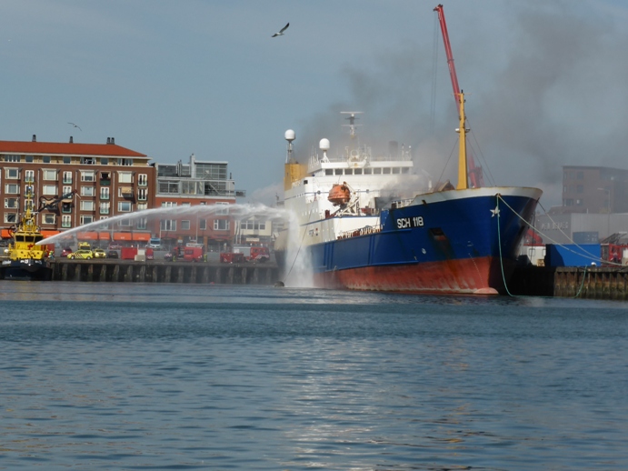 Beim Näherkommen sahen wir dann eine Rauchwolke, und wir sahen, dass im Hafen ein Schiff brennt. Keine Übung, sondern ein Ernstfall. Wie wir später erfahren haben, brennt bei dem Schiff die Isolierung, und die Löscharbeiten dauern schon den ganzen Tag.