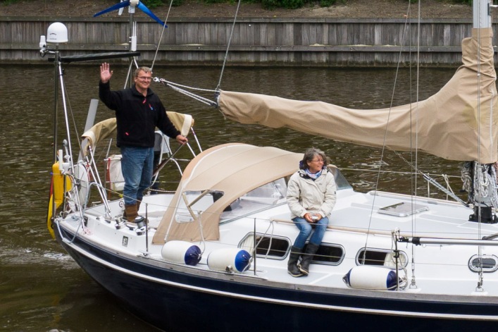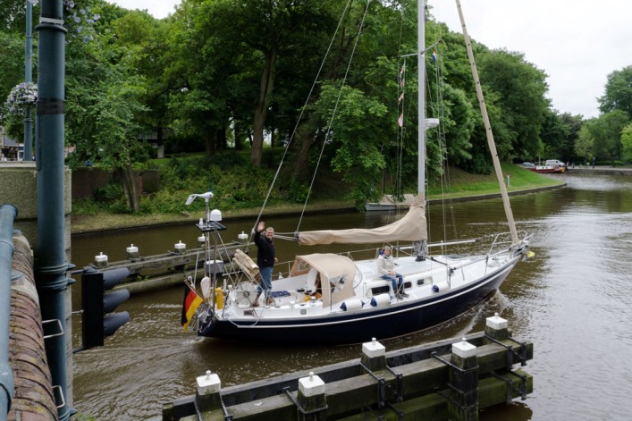 Und dann vor ein paar Tagen bin ich sogar in Leeuwarden in Holland bei der Fahrt durch eine der vielen Brücken fotografiert worden! Das kommt auch nicht so oft vor, dass am Ufer ein bekanntes Gesicht in einer wartenden Gruppe auftaucht, der Mensch uns fröhlich winkt, eine gute Reise wünscht und tolle Bilder von uns macht. Seht selbst: