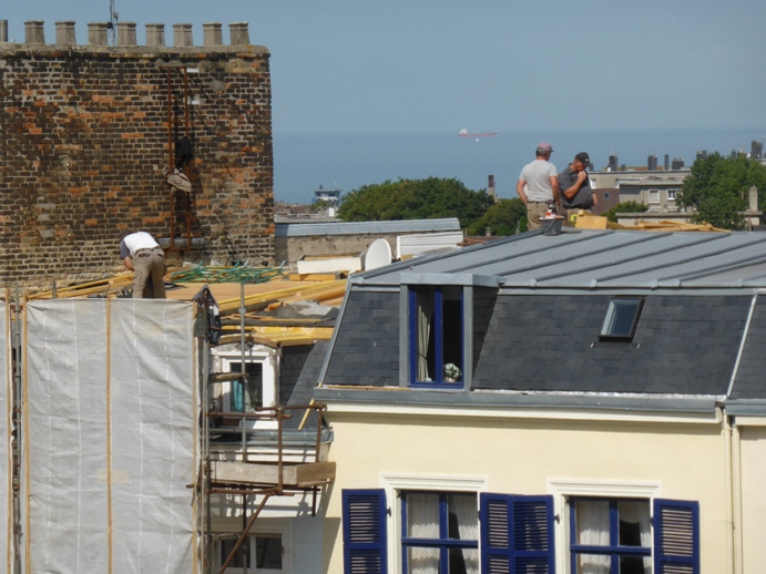 Interessante Ansicht - fanden wir: Im Vordergrund wird ein Dach saniert und im Hintergrund fährt ein Schiff vorbei.