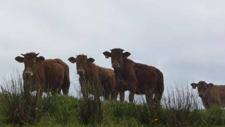 Auf dem Kamm des Berges grasen Rinder und beäugen uns neugierig:
