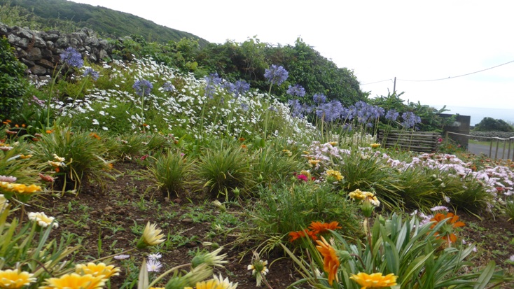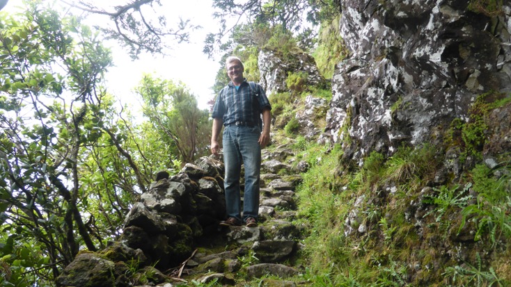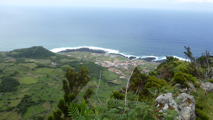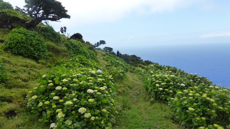 Zunächst geht es über eine sumpfige Wiese den Kamm entlang, dann beginnt der sehr steile Abstieg. Über treppenförmig verlegte Natursteine geht es in Serpentinen hinab. Wir sind etwa 800 Meter hoch, die grasenden Rinder im Tal sind winzig klein, ebenso die Häuser in Faja Grande. In der Nacht hatte es kräftig geregnet und so sind die schmalen, steilen Pfade äußerst rutschig. Mit unseren Bootsschuhen schlittern und glitschen wir Richtung Tal und müssen höllisch aufpassen, nicht auszurutschen oder umzuknicken. An Bord sind glatte Sohlen angebracht, auf einer Bergwanderung sind sie fehl am Platze. Eigentlich eine Binsenweisheit, aber so steil und unwirtlich hatten wir uns das hier auch nicht vorgestellt. Ab und an bestaunen wir die üppige Vegetation, die himmlische Ruhe, das Plätschern eines Bächleins und sind überwältigt von der atemberaubenden Aussicht.