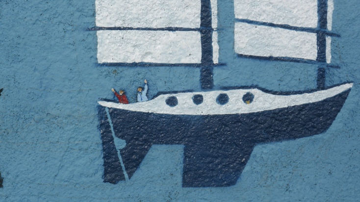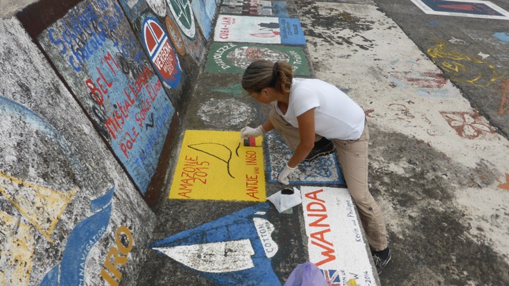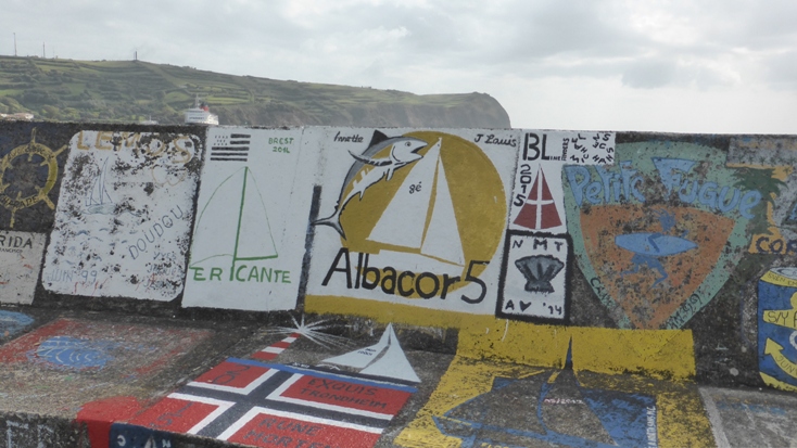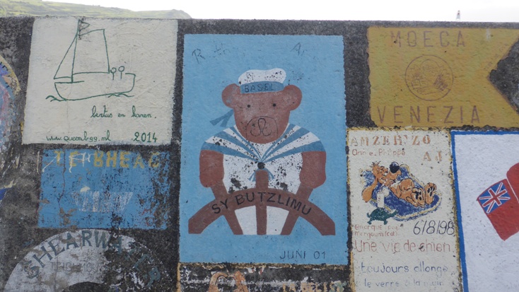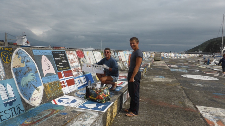 Heute wollen wir uns dem Projekt "Amazone und uns an der Kaimauer in Horta verewigen" widmen. Gewisse Vorkenntnisse haben wir ja schon, weil wir uns an der Kaimauer in Porto Santo bereits verewigt haben. Die Farbdosen haben seitdem schon zweimal den Atlantik überquert, sind aber noch gut in Schuss. Ein freies Plätzchen hatten wir uns gestern schon ausgeguckt. So bewaffnen wir uns mit Drahtbürste, Klebeband, Farben und allerlei anderen Utensilien und legen los.