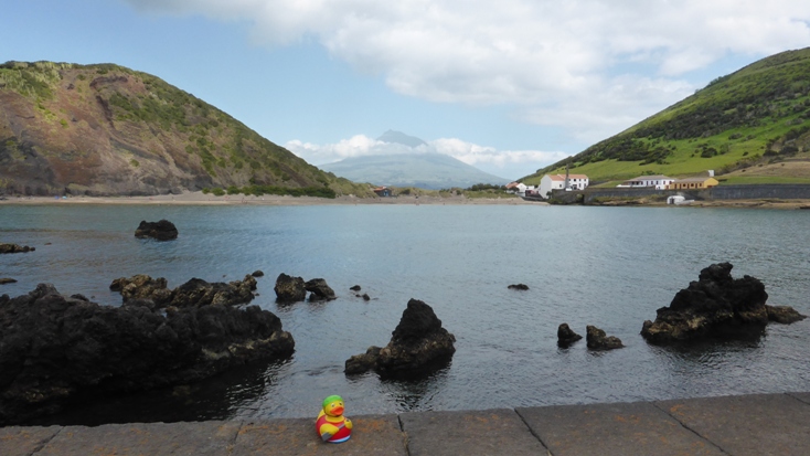 Auch die kleine Ente ist auf den Azoren - im Hintergrund die Nachbarinsel Pico: