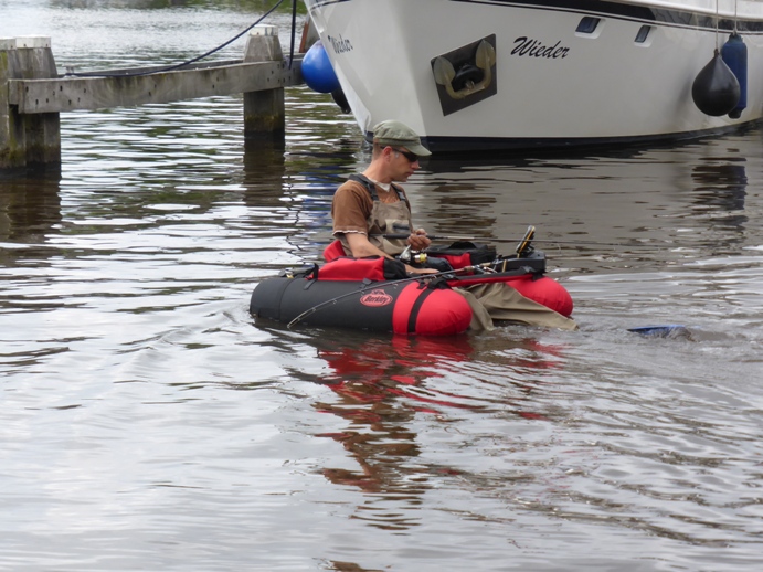 Heute mittag gesichtet: Dieser Angler sitzt in einem schwimmenden, aufblasbaren Sessel. Er trägt eine Anglerhose und hat Schwimmflossen angelegt. Am Sessel angebracht ist ein elektronischer Fish-Finder. Irgendwie kurios.
