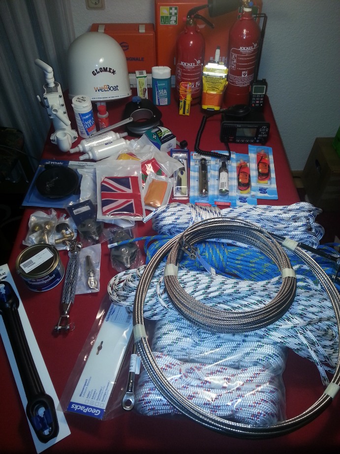 Jetzt haben wir den Großteil unserer neuen Ausrüstung abgeholt. Für Sicherheit, Kommunikation, Ersatzteile, laufendes Gut und ein neues Kutterstag mit 7 mm statt 6 mm Draht. Vieles Weitere und das neue Großsegel sowie die Sturmfock haben nicht auf das Foto gepasst.