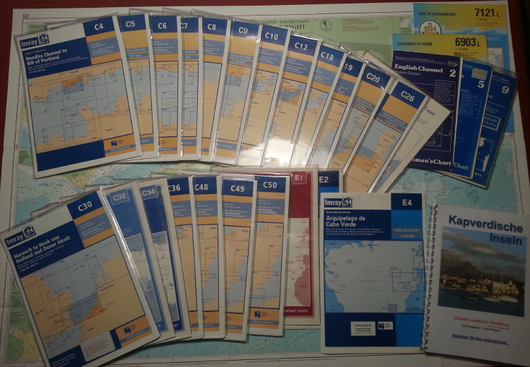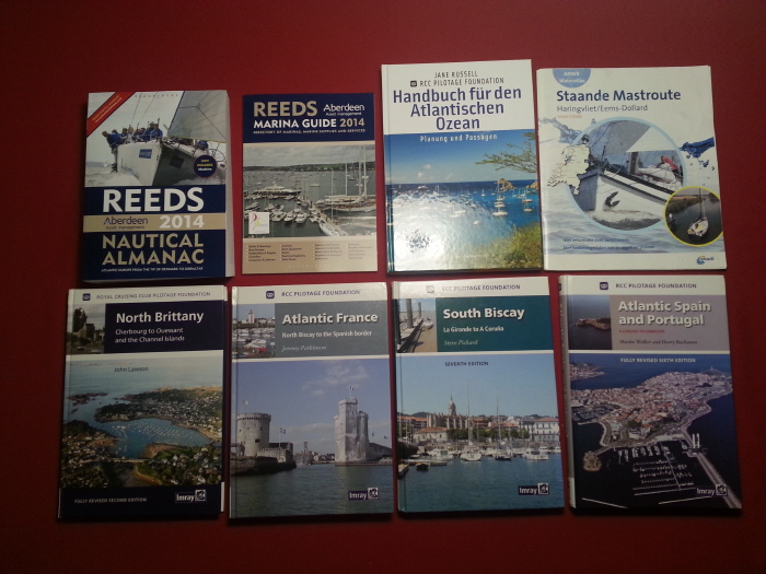 Als Ergänzung haben wir noch den ANWB Wateratlas für die Staande Mastroute durch die niederländischen Kanäle und die aktuellen Revierführer und Hafenhandbücher vom Royal Cruising Club gebraucht kaufen können. Sie decken das Gebiet von Cherbourg bis Gibraltar ab.