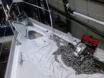 Die mechanische Ankerwinsch ist abgebaut und die Löcher durch das 42 mm (!) starke Deck werden mit Epoxy gefüllt. Für die bestellte elektrische Winsch muss dann u. a. der Ankerkastendeckel verändert werden.