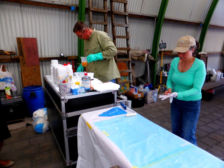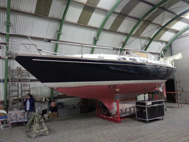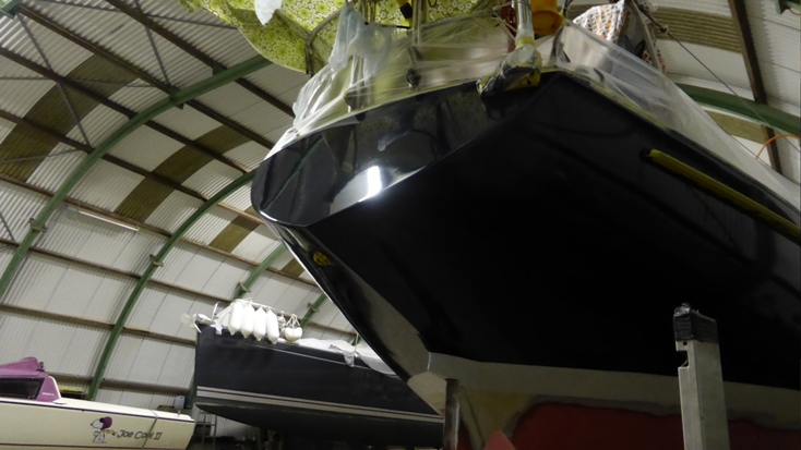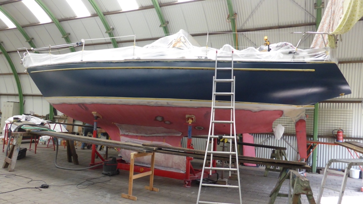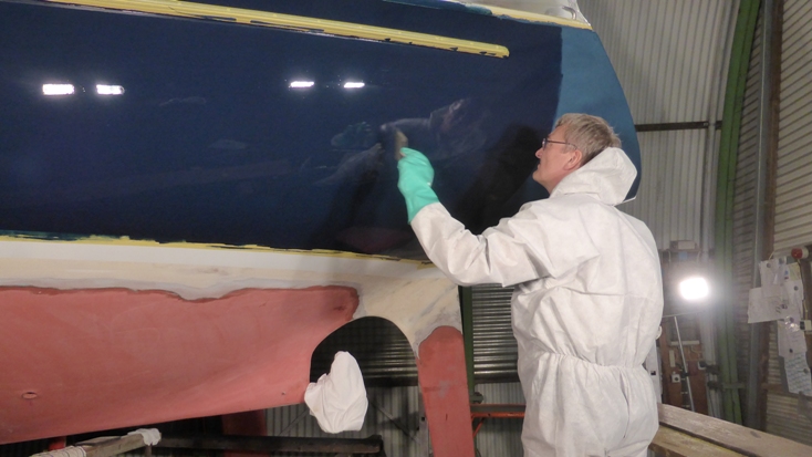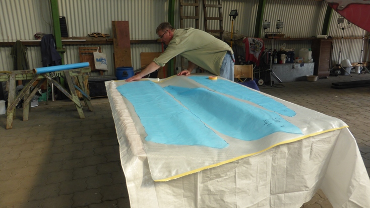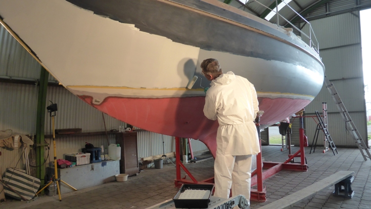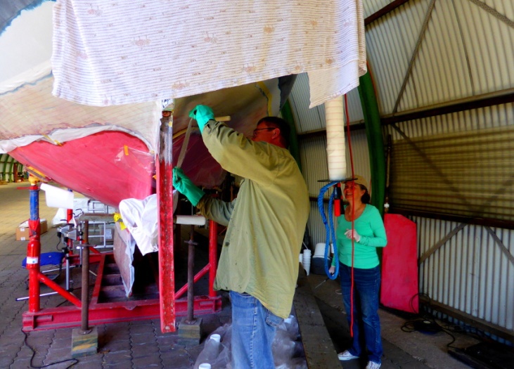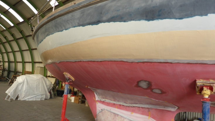 Nach vielen Monaten der Trocknung in der Halle haben wir im September 2016 mit dem Laminieren angefangen, um die verlorene Schichtstärke wieder aufzufüllen. Da das Laminat im Wasserpassbereich 18 mm massiv ist, war es für die Stabilität nicht erforderlich, aber es ist besser als nur Spachtelmasse zu verwenden. Wir haben nass in nass gearbeitet, d. h. nacheinander Epoxy vorgestrichen, Faserspachtel aufgetragen, das vorgetränkte Glasfaser-Gelege aufgebracht und nochmal gespachtelt, bevor wir zum Abschluss Abreißgewebe aufgelegt haben.