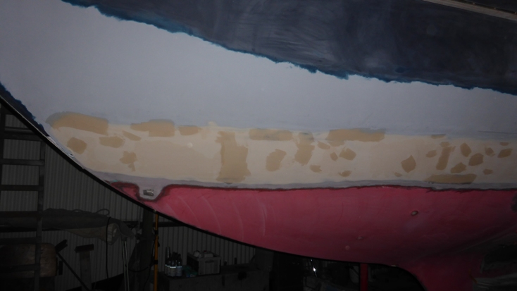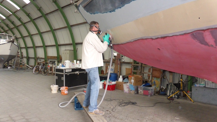 Bei der Übernahme im Jahr 2004 hatten wir auch schon erste Blasen im Kielbereich festgestellt. Das Boot wurde offensichtlich nicht lange genug getrocknet, damit die Feuchtigkeit aus der Gelcoatschicht entweichen konnte. Wir haben die betroffenen Bereiche komplett bis zum Laminat freigelegt und mehrmals mit Frischwasser gespült. In dem Bereich mit feinen Blasen haben wir den Lack entfernt.