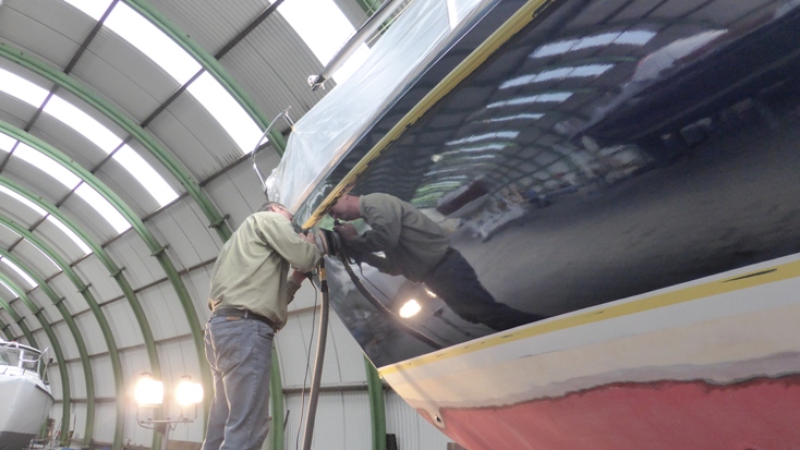 dann wird wieder geschliffen und die erste Zwei-Komponenten-Lackschicht aufgetragen, die mit einem Schaumpad verschlichtet wird: